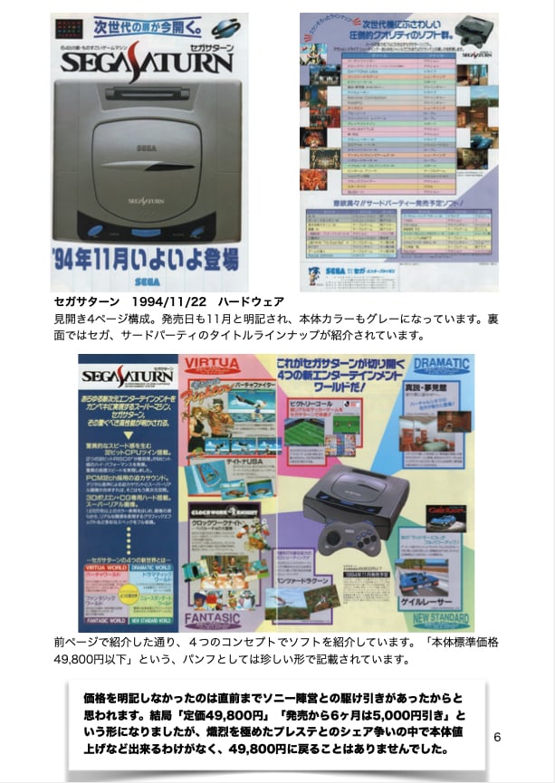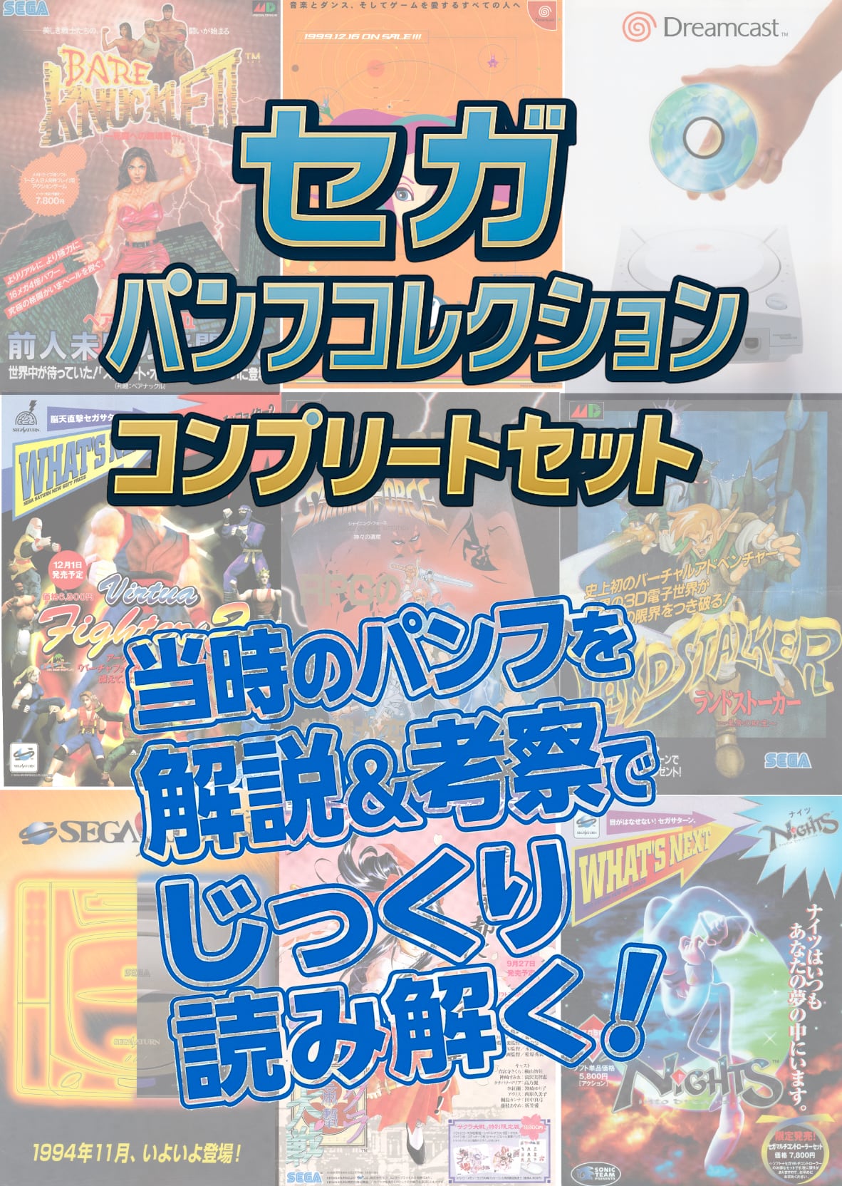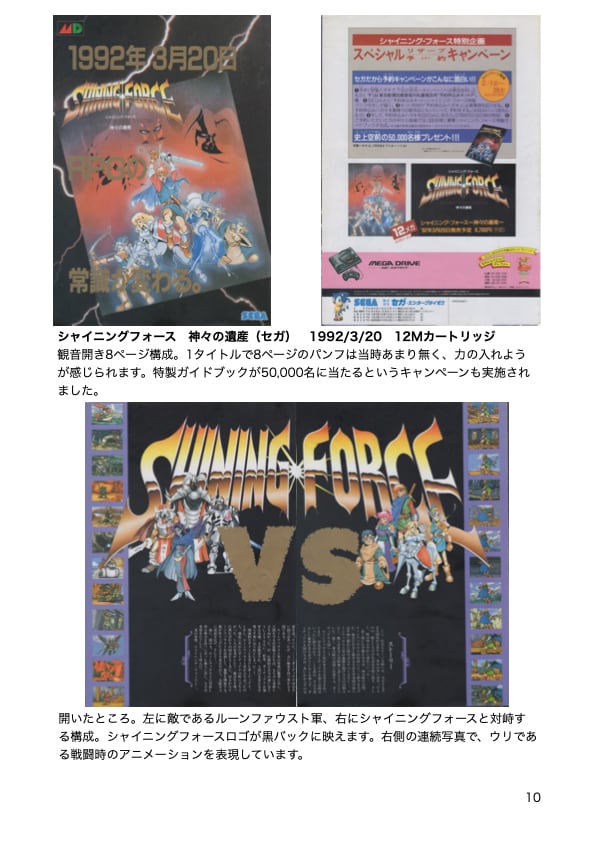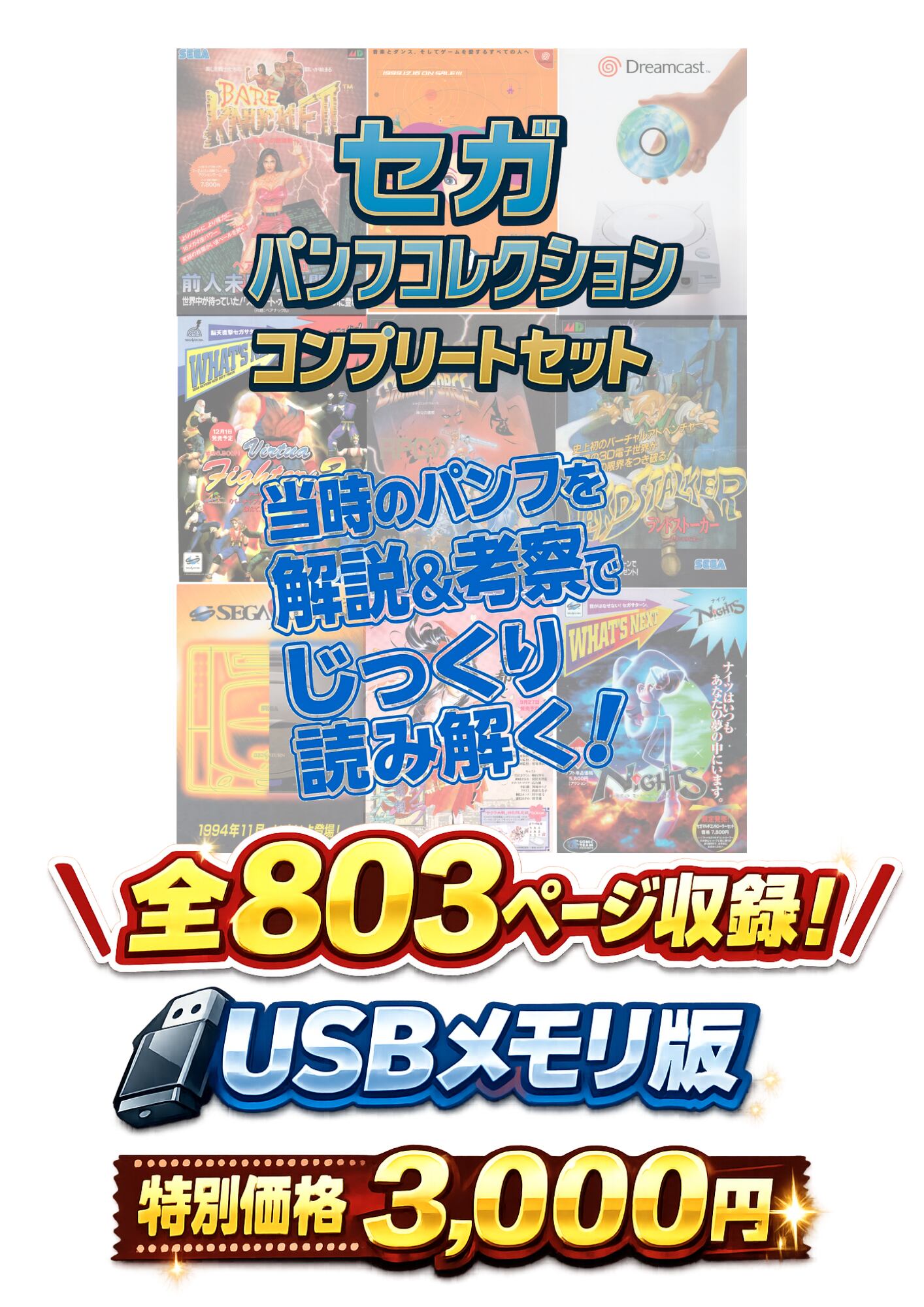 関連のパンフレットを解説、考察した同人誌です。USBメモリにて、メガドライブ、セガサターン、ドリームキャスト、そしてハード撤退後のパンフレットを収めています。全803ページにわたって、セガの歴史を彩った名作たちの魅力を存分に感じることができます。